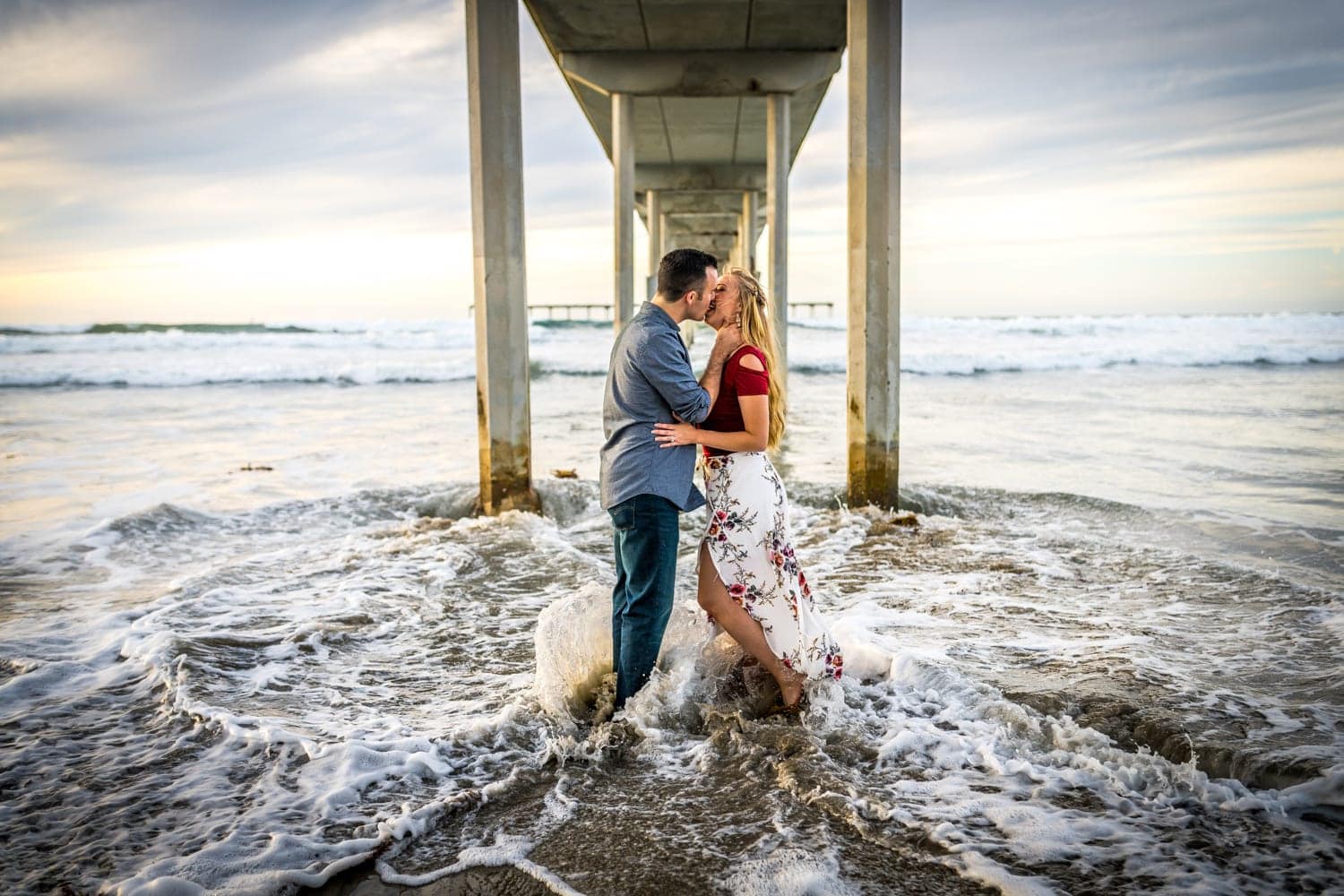 All elements combined make this engagement session one for the record books! Heather, Jim and their two fur babies showed up for their engagement session at the dog friendly beach called Ocean Beach and we instantly hit it off. The conditions were perfect for photography just the slightest overcast skies offering up soft diffused light. We were able to get some amazing engagement photos with the dogs despite the distraction and excitement of being at the beach. But our favorite photos came later in the day as golden hour edged in on us we took a stroll toward the pier. It was beautiful the way the pier framed out the photos and how the sun illuminated them from the side. As the tide picked up a wave came and swept over Heather & Jim’s feet enveloping them beautifully for an amazing shot worth getting wet for. They were such amazing sports despite getting wet. They just laughed it off and we continued along the beach towards the rocky shoreline. The sun began to set making for some amazing sunset engagement photos. Overall, one of our favorite engagement sessions, hands down!